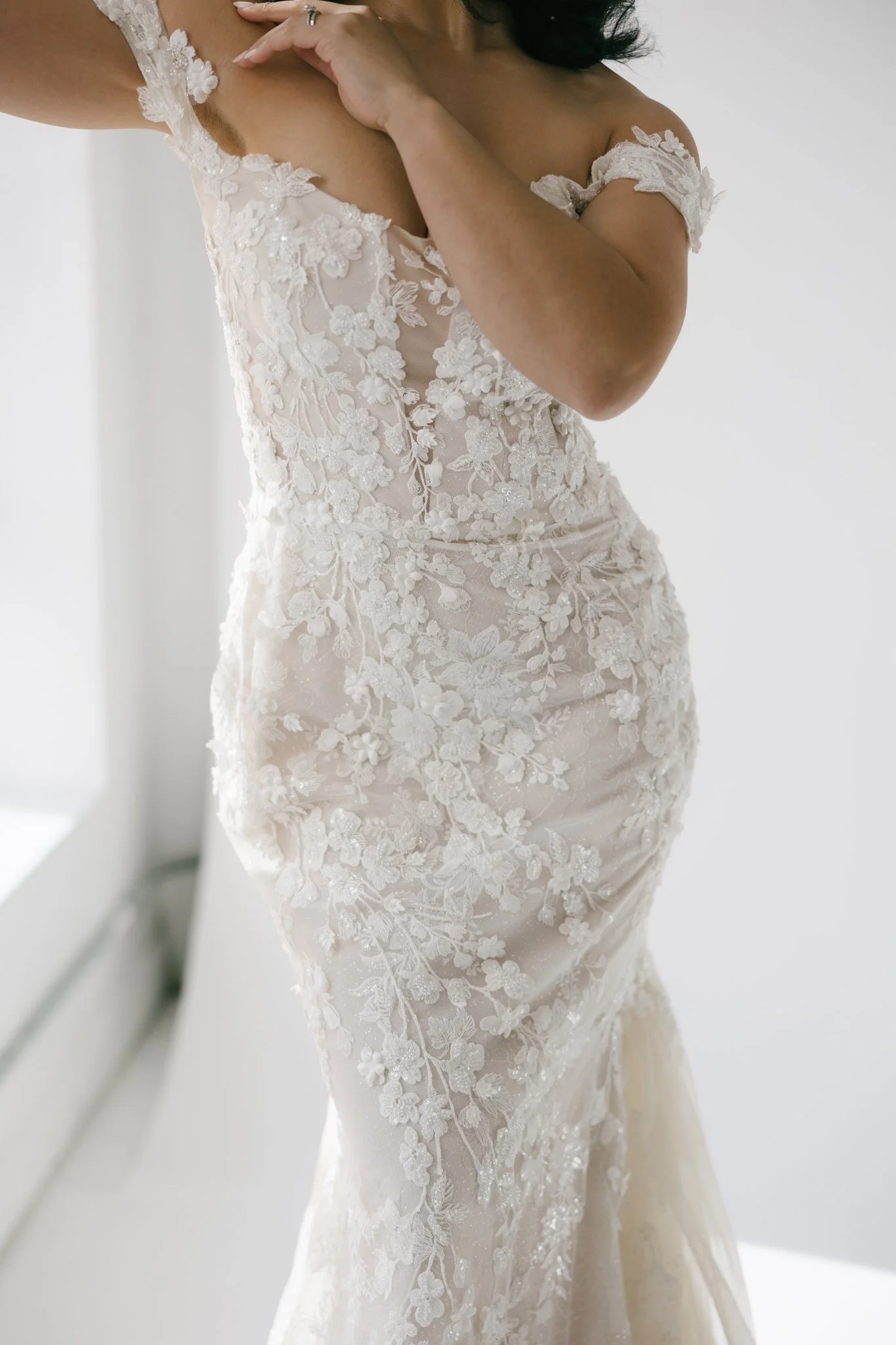 The studio’s minimalist aesthetic allowed the bride’s beauty and the gown’s exquisite details to shine, while custom florals in soft pastels added a subtle romantic touch. The combination of natural light and strategically placed studio lighting emphasized the textures and craftsmanship of the gown, as well as the bride’s natural elegance. Every shot felt like a work of art, from the dramatic full-length portraits to the intimate close-ups that captured the raw emotion and grace of the moment.